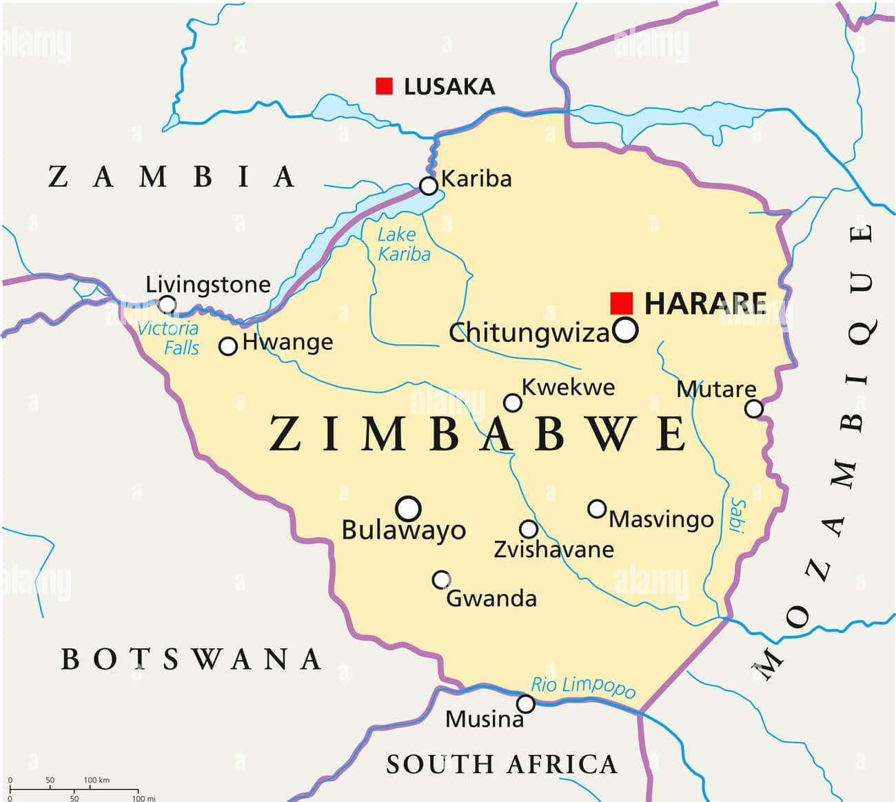 - Landmarks such as Victoria Falls and Lake Kariba.
