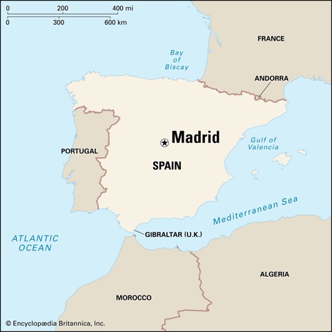 - Land Boundaries include Portugal to the West, Andorra and France to the North-East, Gibraltar (British Overseas territory) and Morocco to the South.