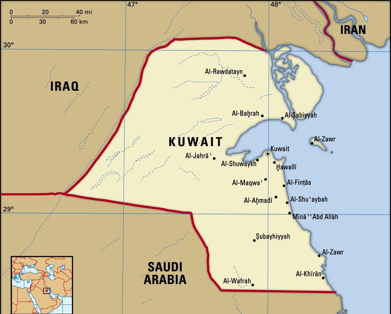- स्थलाकृति: कुवैत खाड़ी के पश्चिमी छोर पर अल-जहरा नखलिस्तान के साथ मुख्य रूप से रेगिस्तान