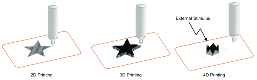 - 4 डी प्रिंटिंग 3 डी प्रिंटिंग की प्रगति है जो समय के तत्व को शामिल करती है।