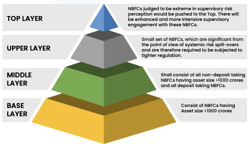 - SBR का मतलब NBFC का पृथक्करण है, जो NBFC को उनके आकार, गतिविधि और जोखिम के कथित स्तर के आधार पर चार परतों में वर्गीकृत करता है।
