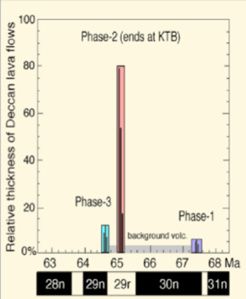 - Phase 2 with 80% of total Deccan volume occurred around 65 Ma and ended below the KT boundary.