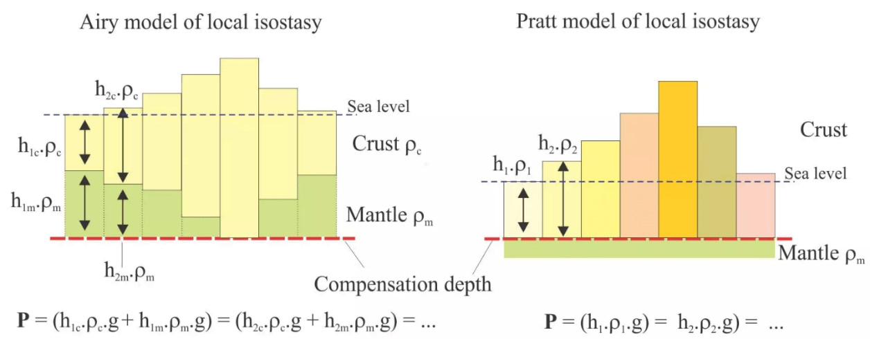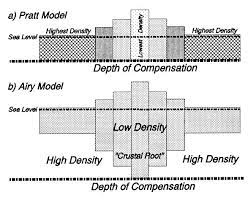 - Pratt–Hayford model: different topographic heights are accommodated by lateral changes in rock density.