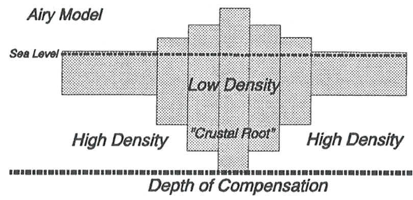 In the following figure, each column has the same area and extends downward to the same depth below sea-level, the same depth at which the weight of each column exerts approximately the pressure on the underlying material, irrespective of its surface elevation.