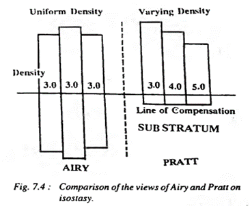 - As per Bowie, both Airy and Pratt are similar, but not the same. Airy postulated a uniform density with varying thickness, and Pratt a uniform depth with varying density.