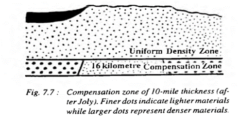 - There is a 10-mile zone of compensation. The density varies in this zone. There is uniform density of rocks with varying thickness above this zone.