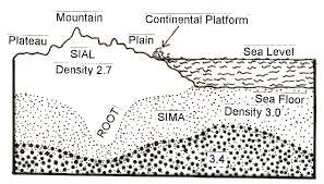 - The crust of relatively lighter material is floating in the substratum of denser material. i.e., Sial is floating over Sima, or the lithosphere is floating over the asthenosphere.
