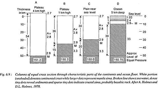 They have also assumed that upstanding crustal parts are made of lighter materials and their major portions are submerged in greater depth of lighter materials.