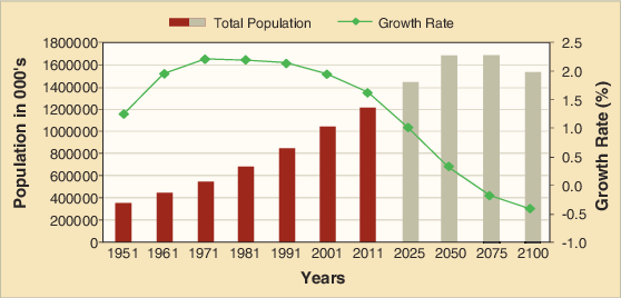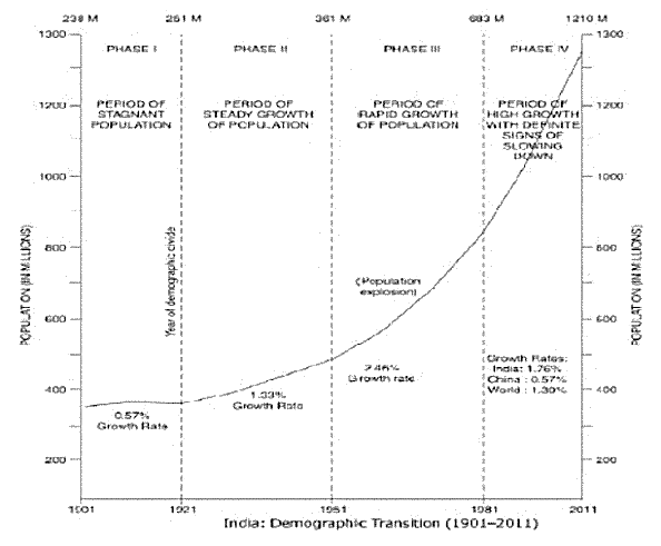 India’s population growth during twentieth century can be chartered and classified into four distinct phases of the demographic transition.