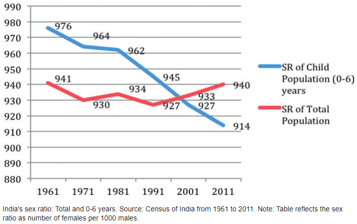 - The Indian population has shown a persistent, deficit of women since the first census conducted in the British provinces in 1881. The deficit has increased progressively and the sex ratio of the population has declined from 972 in 1901 to 940 in 2011 with minor ups and downs between 1901 to 2011.