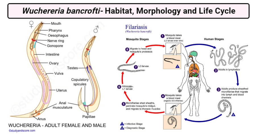 • Morphology: Wuchereria bancrofti is a parasitic nematode with a thread-like, elongated body. The adult female measures around 80–100 mm in length, while males are around 40 mm.